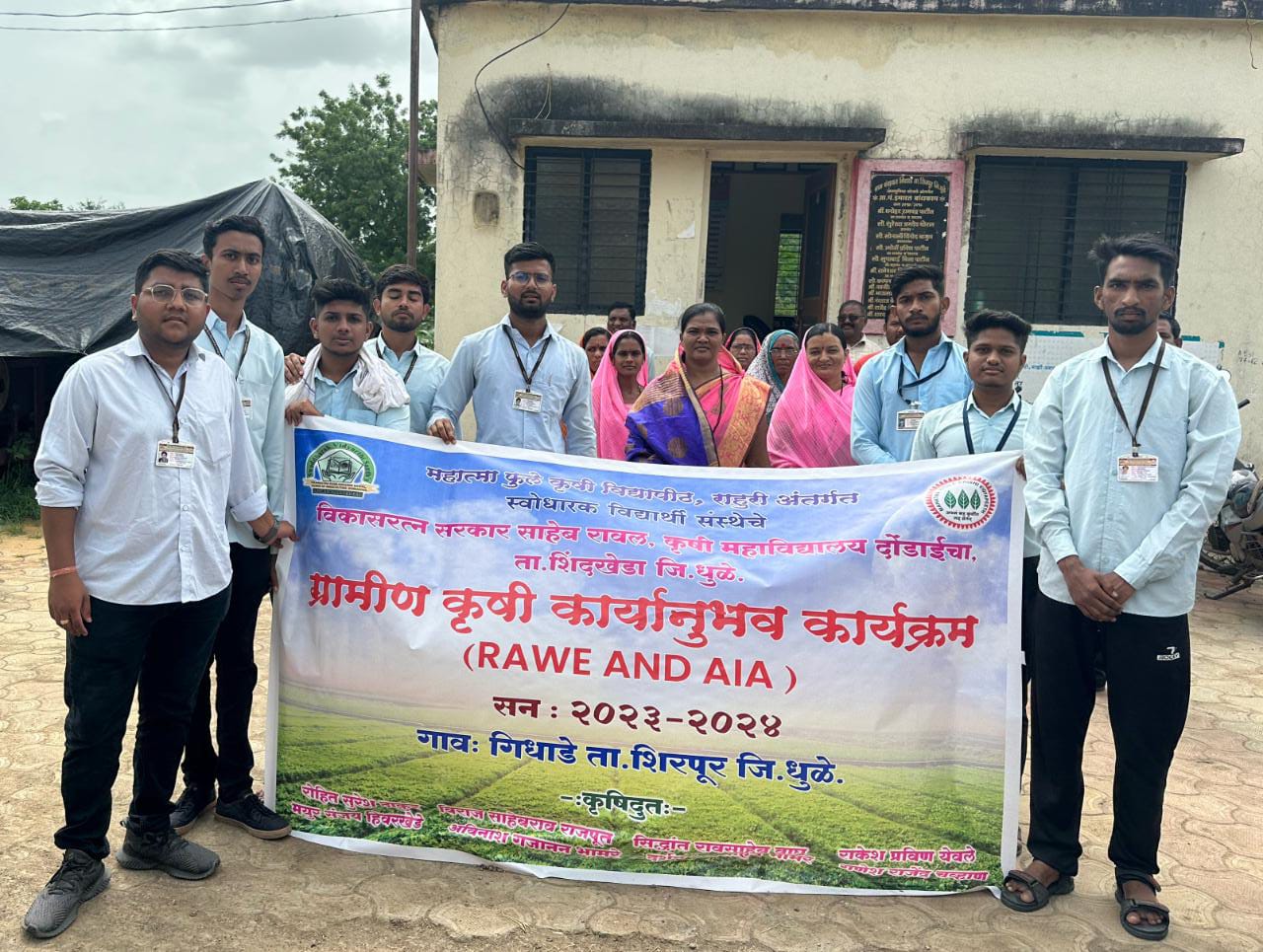 *कृषि दुतांनी केले मातीची सुपिकता टिकविण्याविषयी शेतकऱ्यांना मार्गदर्शन*प्रतिनिधी गोपाल कोळीदोंडाईचा ता. महात्मा फुले कृषी विद्यापीठ राहुरी संचलित विकास रत्न सरकार साहेब रावल कृषी महाविद्यालय दोंडाईचा येथील कृषि पदवी (बी. एस. सी कृषि) अभ्यास क्रमाच्या अंतिम वर्षाच्या विद्यार्थ्यांनी कृषि कार्यानुभव कार्यक्रमाअंतर्गत मौजे गिधाडे येथे शेतकऱ्यांच्या उपस्थितीत कृषी दुतांनी आज ग्राम विकास अधिकारी कार्यालयात “मेरा देश मेरी मिट्टी” या कार्यक्रमाचा शपथविधी घेण्यात आला व शेतकऱ्यांना मातीचे महत्व व सुपीकता कशी टिकवावी यावर मार्गदर्शन करण्यात आले. यावेळी ग्रामविकास अधिकारी श्री. अनिल लक्ष्मण झाल्टे साहेब व सरपंच श्रीमती अक्काबाई नारायण वाघ व ग्रामस्थ उपस्थित होते. या कार्यक्रमासाठी महाविद्यालयाचे प्राचार्य श्री. आर. बी. राजपूत सर ,उपप्राचार्य आर बी पाटील सर तसेच कार्यक्रम समन्वयक डॉ. विवेक चव्हाण सर व कार्यक्रम अधिकारी प्रा. इंद्रजीत गिरासे सर व प्रा. शरद भोपळे सर यांचे मार्गदर्शन लाभले.